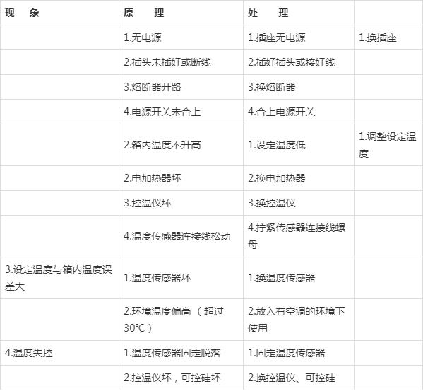 箱體采用優質冷軋鋼板,表面靜電粉末噴涂,涂層堅硬牢固,具有極強的防銹能力。工作室為優質冷軋鋼板,圓角造型、光滑、流暢、極易清潔。箱體與工作室之間,充填超細玻璃棉隔熱材料,具有良好的保溫功能,有效保證箱內溫度的穩定準確和對使用環境的影響。箱內設計有合理的熱風循環通道,使箱內溫度分布更加均勻、溫度上升更快;并裝有出風管,用以微量排出箱內的空氣。如箱內排出的氣體有異味或有毒,出風管能方便的另接管道將氣體排至指定地點。溫度控制采用微電腦智能數字技術制造,具有工業PID自整定和四位雙LED窗指示功能,控溫精度高、抗干擾能力極強,并且操作也非常方便。采用耐高溫硅膠作密封門邊,高溫發熱作發熱元件,確保安全,使用壽命更長;符合人體工程學的扣緊式拉手,方便操作,且確保密封性。三、故障維修處理